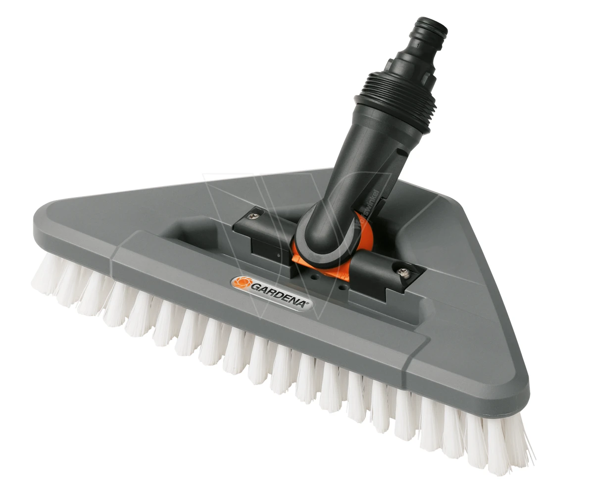 De GARDENA zwenkschrobber heeft een praktische driehoekige vorm voor niet-toegankelijke plekken. Met deze borstel kunt u moeiteloos op smalle plekken en in bochten of hoeken reinigen die niet toegankelijk zijn met andere borstels. Het draaischarnier helpt u daarbij. Het kan 360° draaien. De zwenkschrobber kan flexibel worden ingesteld, zodat het overal kan worden gebruikt.